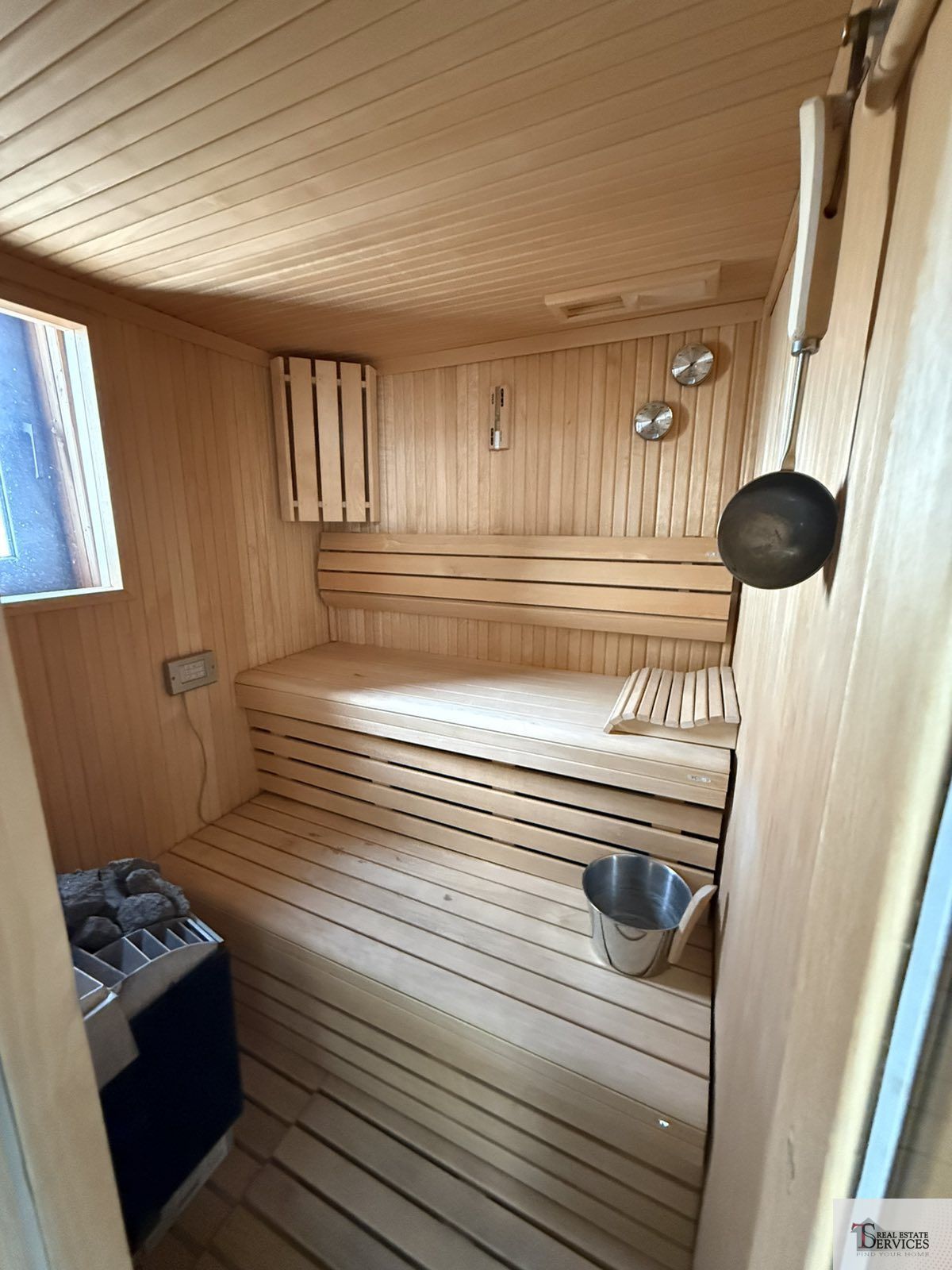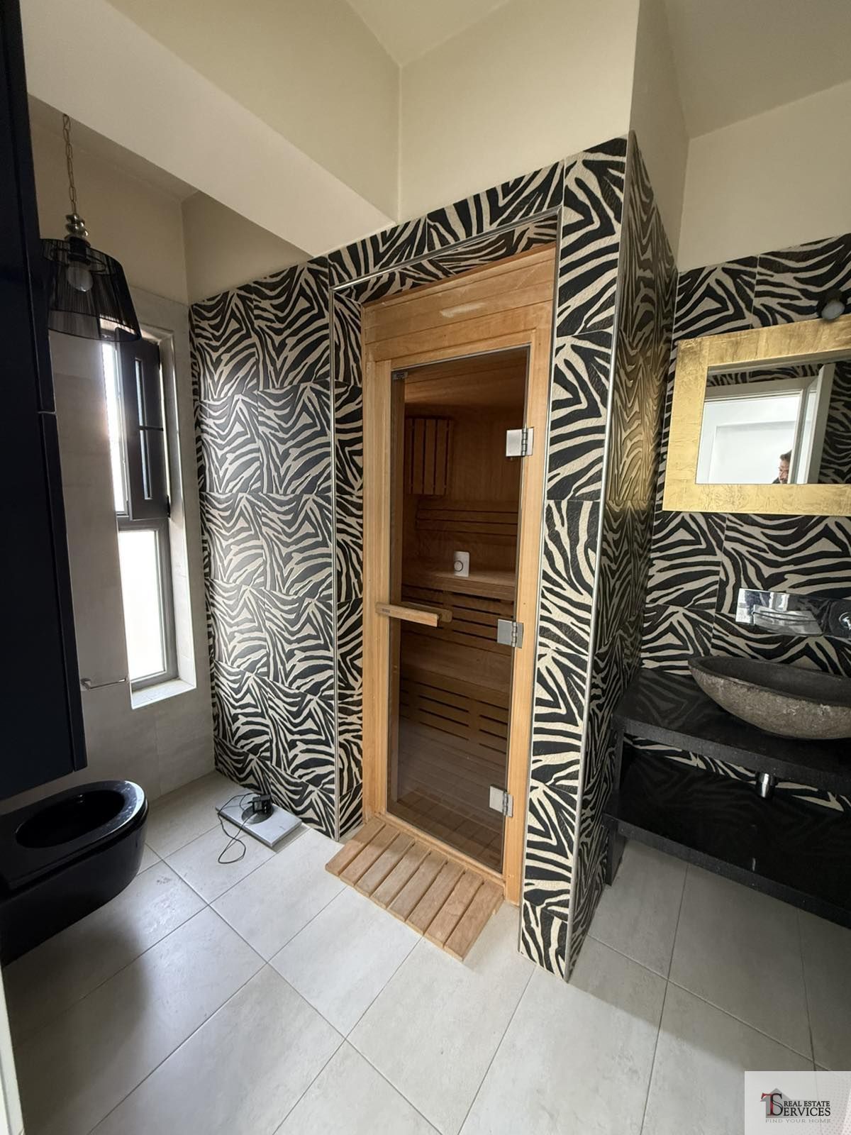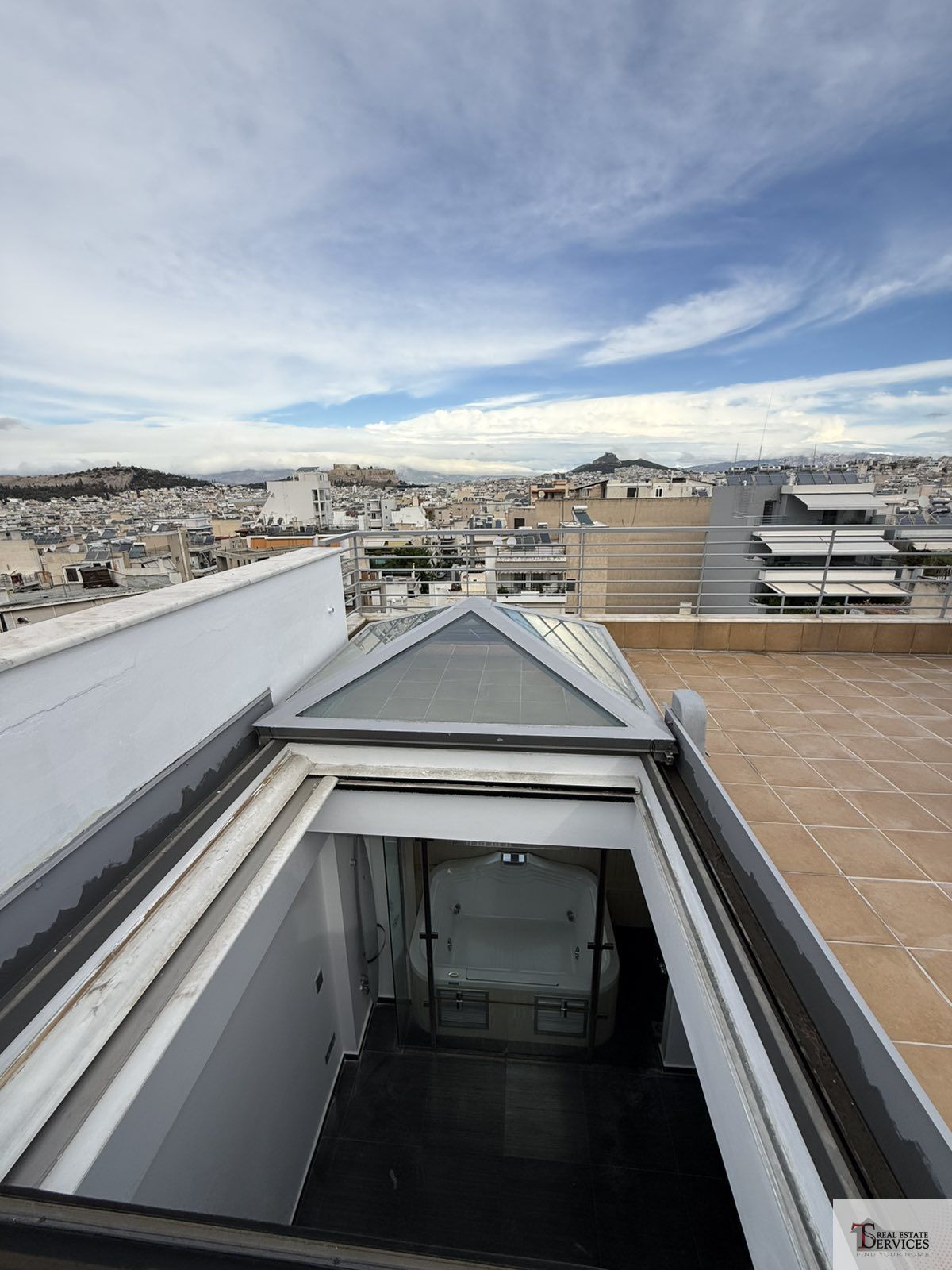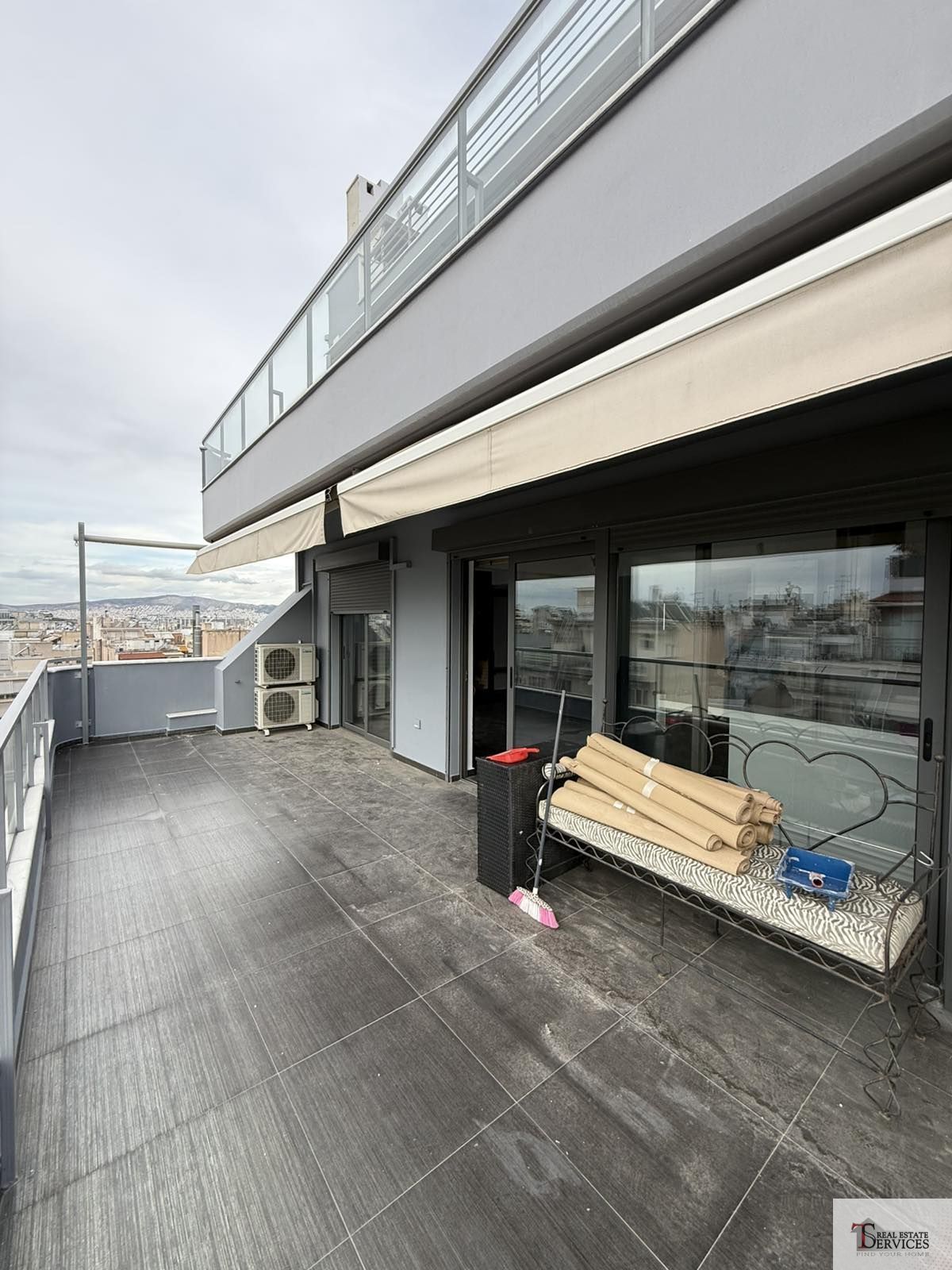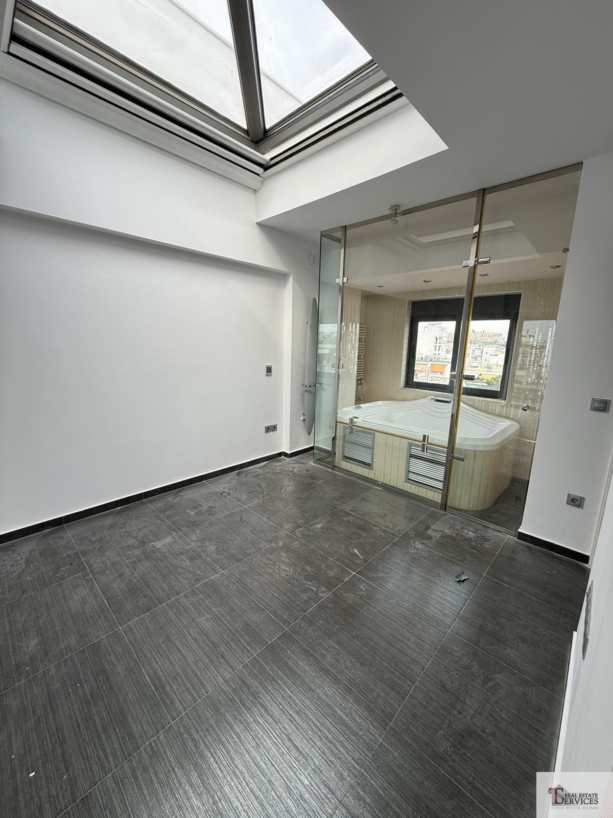 Είναι διαρρυθμισμένο σε 2 επίπεδα που ενώνονται με γυάλινη εσωτερική σκάλα. Στον 6ο όροφο υπάρχει σαλόνι με τζάκι, κουζίνα εξοπλισμένη με ηλεκτρικές συσκευές gaggenau (φούρνος, εστίες, πλυντήριο πιάτων, ψυγείο, καταψύκτη, φούρνο μικροκυμάτων, wine cooler) και 1 WC, ενώ ο 7ος όροφος αποτελείται από 1 master bedroom με τζάκι, σάουνα, τζακούζι και ηλεκτρική οροφή με θόλο κ δυο τέντες σκίασης, 1 υπνοδωμάτιο και 1 μπάνιο . Επιπλέον διαθέτει μεγάλες βεράντες, αποθήκη στο υπόγειο και κλειστή θέση στάθμευσης.