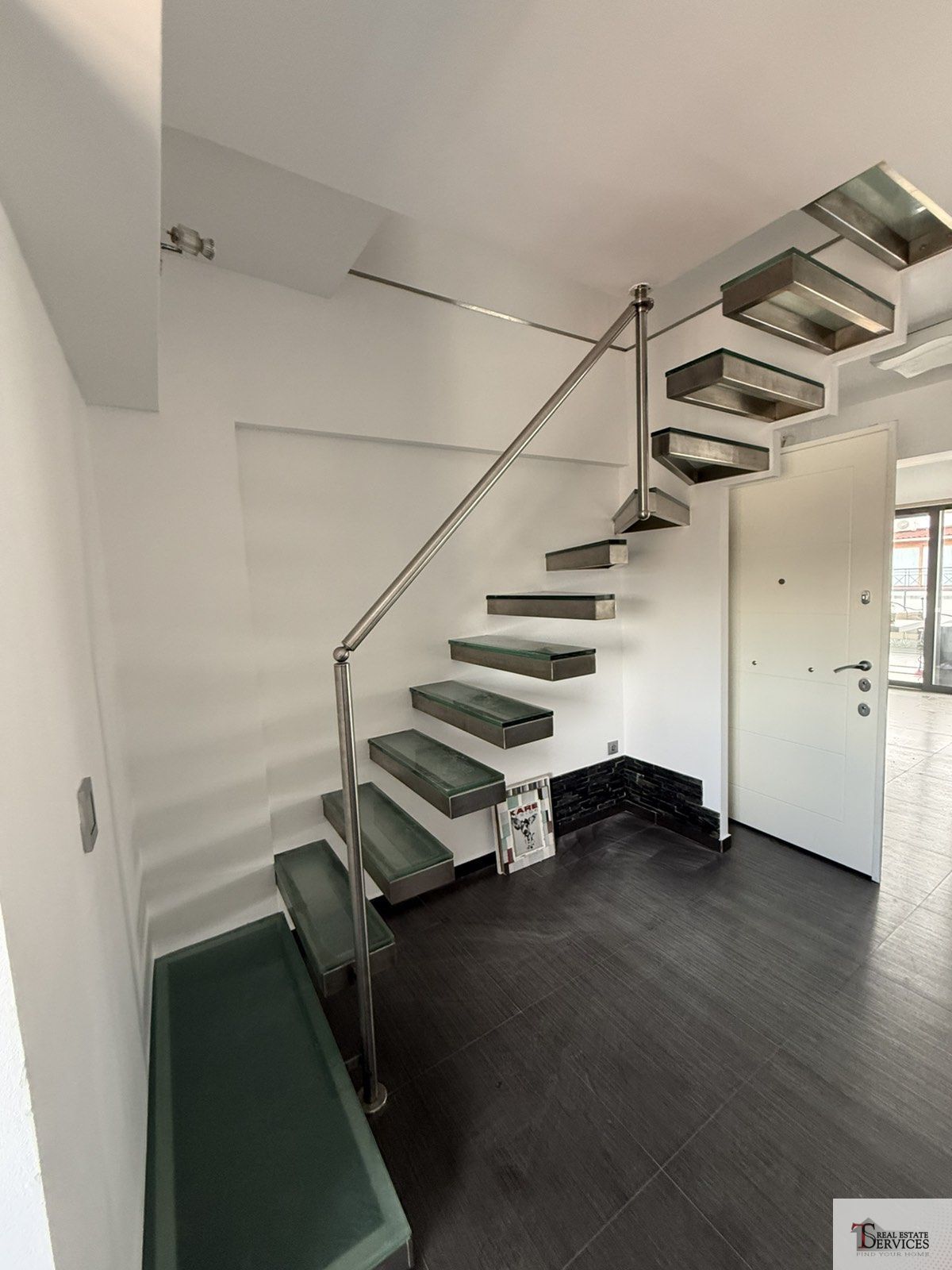 Στα εσωτερικά του στοιχεία αξίζει να σημειωθούν οι πόρτες ασφαλείας (πρόσβαση στο διαμέρισμα και από τους 2 ορόφους) και ο συναγερμός.