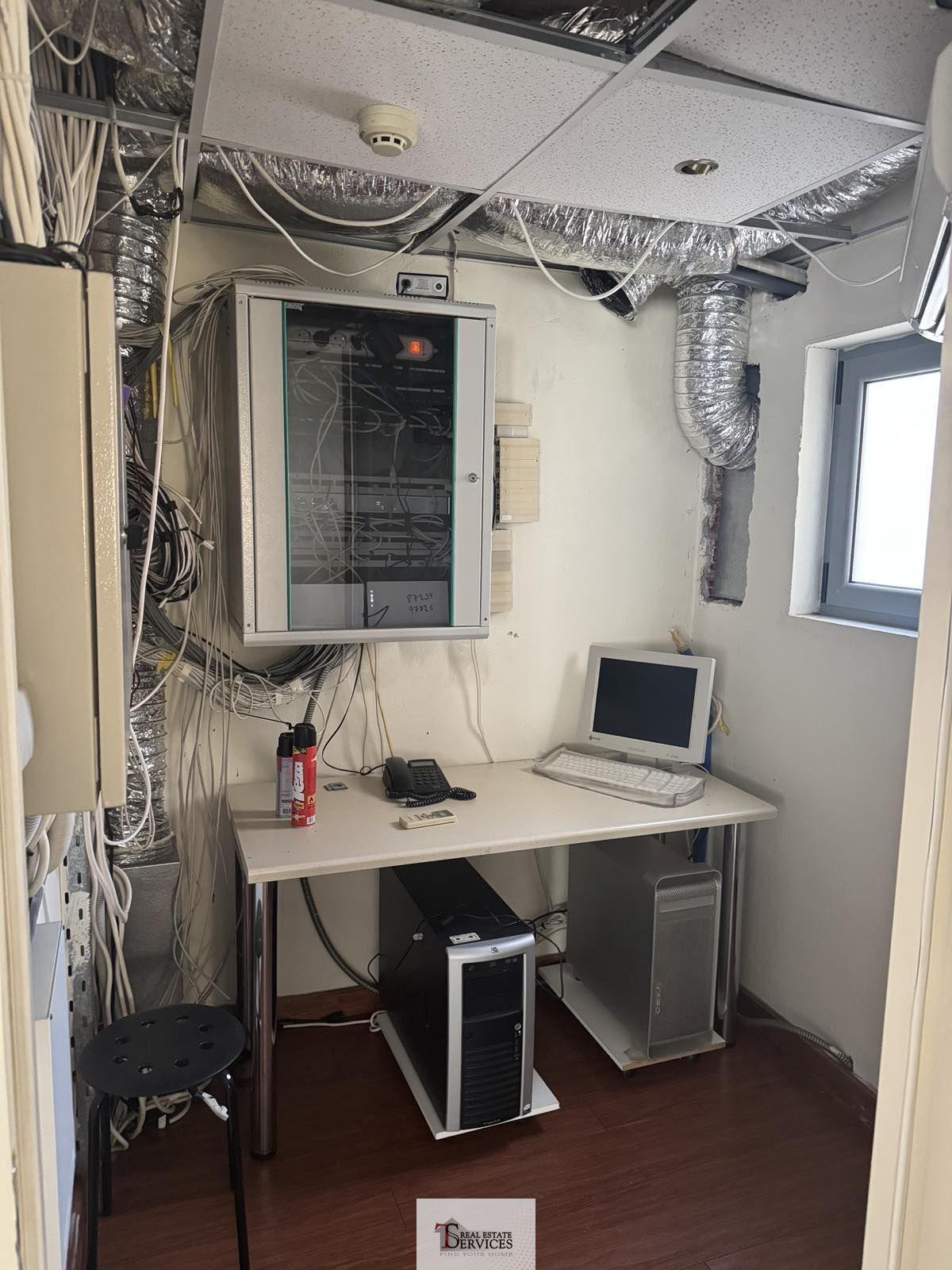 Στα εσωτερικά του στοιχεία αξίζει να σημειωθούν ο συναγερμός, το τηλεφωνικό κέντρο, οι αισθητήρες πυρκαγιάς, η μεγαφωνική εγκατάσταση, οι υποδαπέδιες και επιτοίχιες καλωδιώσεις (4 πρίζες ρεύματος, 2 πρίζες UPS, 4 πρίζες τηλεφώνου-internet).